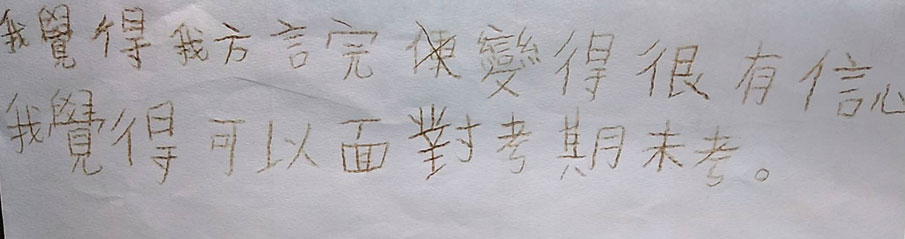今天為兒童學校這兩個月的課程做見證 兒童學校12月份時的課程是認識聖靈,課程之後,潘媽媽和幾位同工帶領小朋友們領受方言,1月份兒童學校的課程,是教導兒童認識方言禱告,以及用方言禱告黙想經文。所用的經文是約翰福音7:38經文-信我的人就如經上所說,從他腹中要流出活水的江河來。 小朋友們方言禱告完之後,我請他們將剛才的領受畫下來, 以下是兒童們的見證: 1潔西:我說方言時我看見耶穌在天上 天上有很多雲 2以樂:我說方言的時候我看見自己躺在海上而且周圍都很溫暖 3世軍:我說方言時我感覺很開心 就像在天堂 有陽光照在我身上 很溫暖 4彥博:我覺得我方言說完以後變得很有信心 我覺得可以有勇氣面對期末考 5煒傑:我說方言時一開始肚子很痛後來就不再痛了 (小朋友的見證,一邊慢慢說一邊給大家看圖) 看到兒童們能夠在方言禱告中滿有領受,非常感謝神,今後我們每次聚會都會要花時間來操練方言禱告,期待兒童學校每一位小朋友,都能在屬靈上越來越強壯,更多認識神。