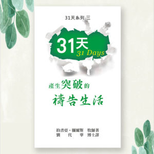 我們很高興推薦31天產生突破的禱告生活,這是約書亞另一本從他的榮耀寶箱中,拿出的工具。他有能力以一種非常有果效的方式,使用神的話語來挑戰我們。當你接受他的挑戰就得祝福,並在你的禱告生活中翱翔,超越所有限制。